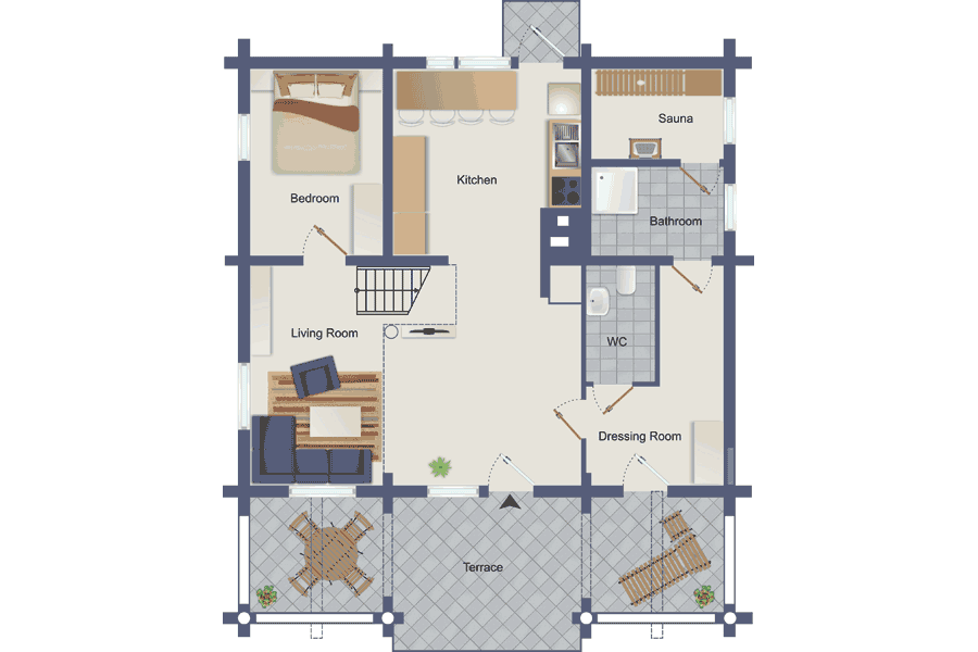 Untergeschoss: Wohnzimmer mit Cheminée, Küche mit Essplatz, 1 Schlafzimmer, Toilette, Badezimmer mit Dusche und Sauna, Terrasse